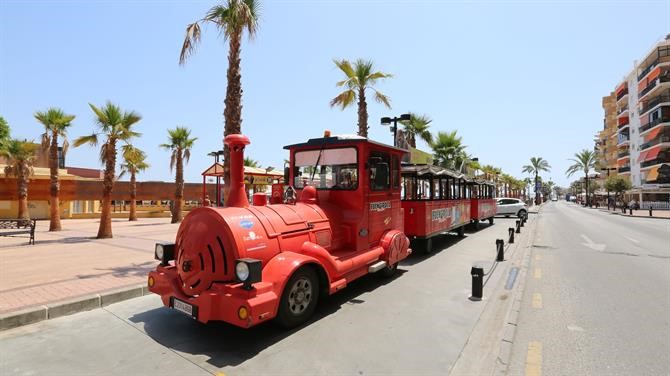 Departure times begin at 10:00 am, and go at 11:15, 12:30, 16:00, 17:15, 18:30, 19:45, 21:00, 22:15, 23:15, and the last one at midnight. The train departs at these times from a central location along the paseo maritimo, found on the map below.