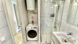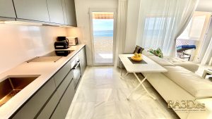 The living area is thoughtfully designed with a modern, elegant touch. Two spacious leather sofas invite you to relax in comfort, while air conditioning and a full entertainment system ensure a pleasant and enjoyable stay. High-speed wireless internet is included throughout the apartment. Large windows fill the space with natural light and offer beautiful, uninterrupted views of the sea directly from the living room.